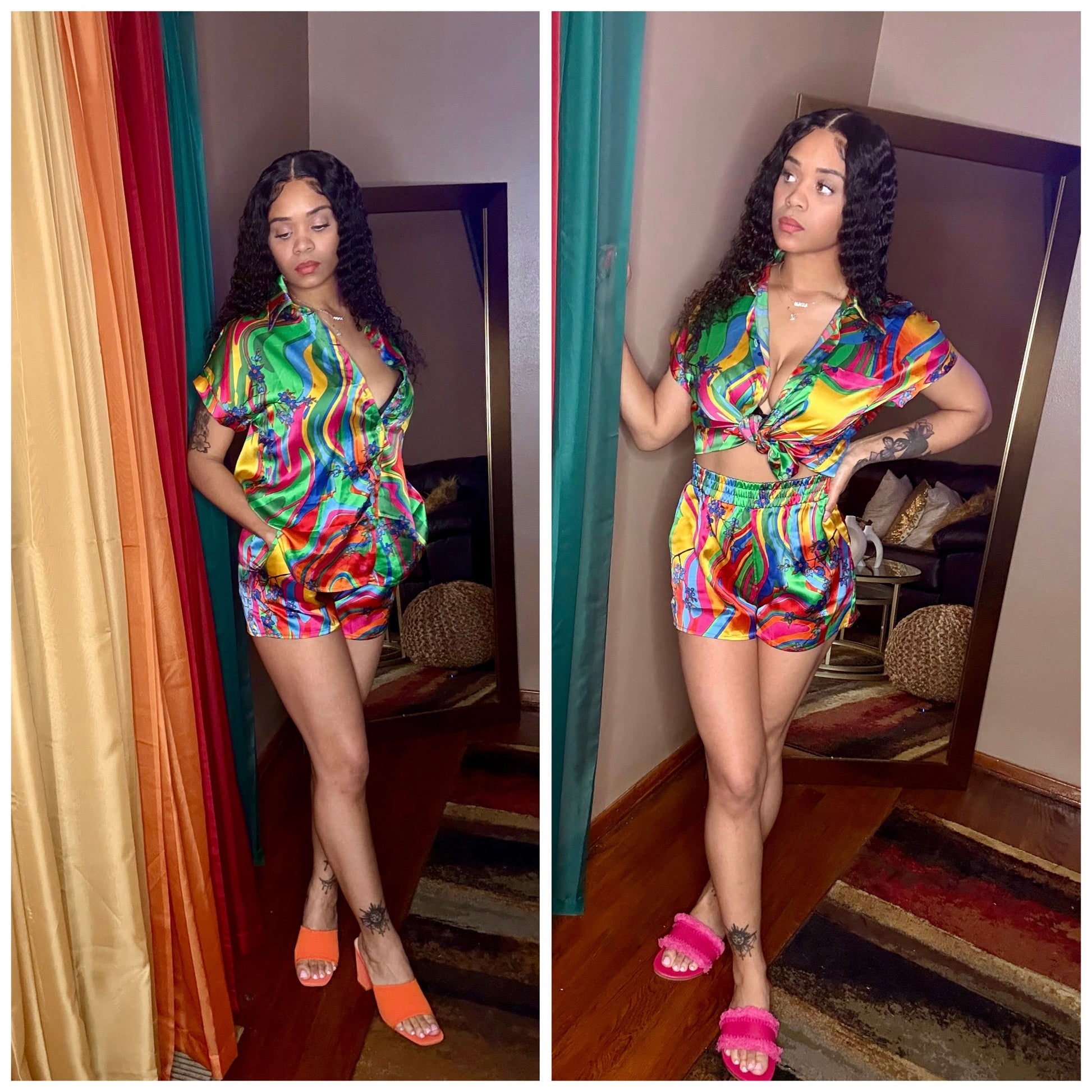 Satin set that screams vacation , with elastic waistline and a button down top.